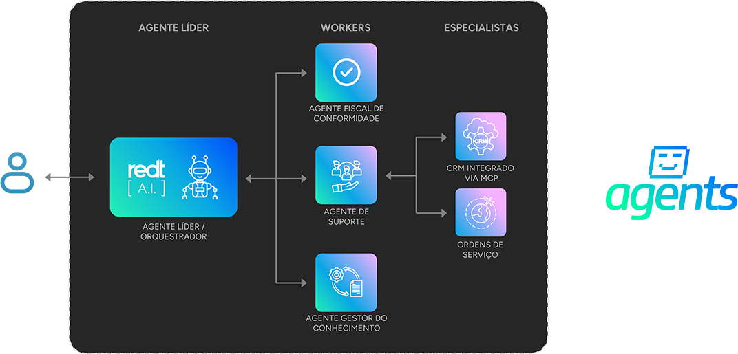 Os RedT AI Agents são agentes de Inteligência Artificial desenvolvidos para atuar de forma autônoma em diferentes frentes do seu negócio: do atendimento ao cliente à automação de processos internos, passando por análise de dados e suporte técnico.